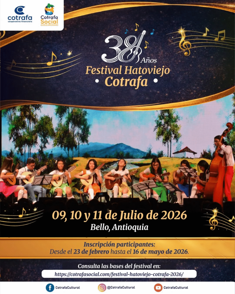 Ya están disponibles las bases técnicas para participar en la edición número 38 del Festival Hatoviejo Cotrafa, que se celebrará los días 9, 10 y 11 de julio de 2026 en el municipio de Bello – Antioquia.