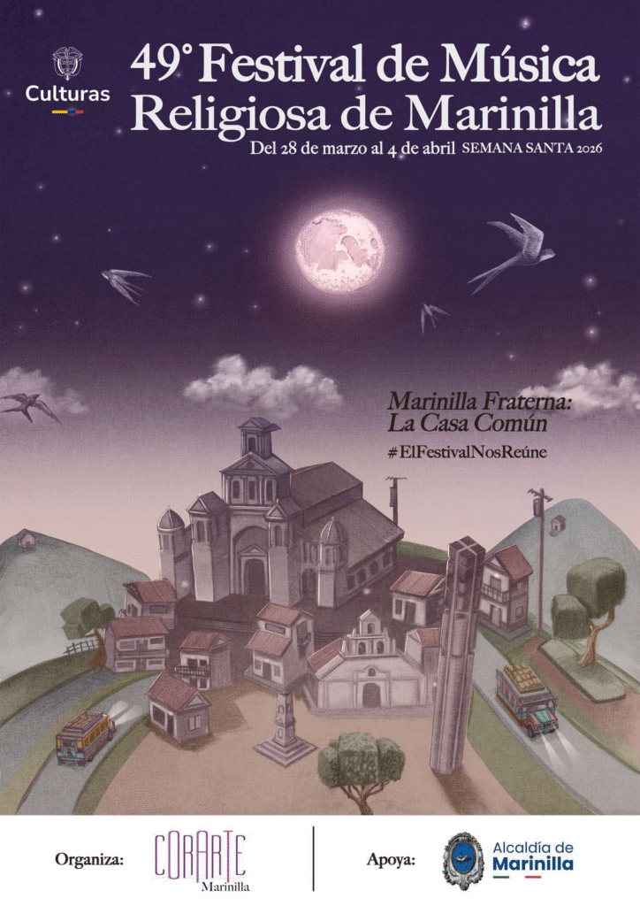 Del 28 de marzo al 4 de abril de 2026 se llevará a cabo el 49 “Festival de Música Religiosa “Marinilla Fraterna: La casa común“, certamen organizado por la Corporación Amigos del Arte – CORARTE – con el apoyo del Ministerio de las Culturas, las Artes y los Saberes, la Administración del Municipio de Marinilla y de algunos aportantes públicos y privados del Oriente antioqueño.